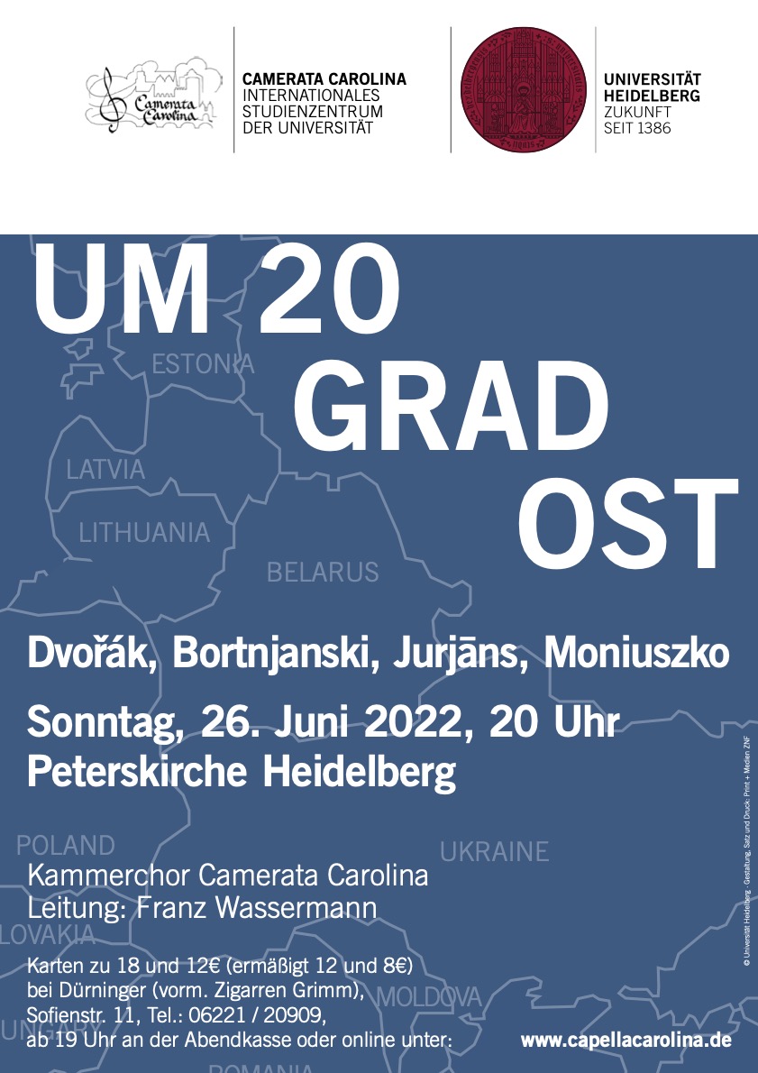 Dieses Konzert hat den Titel Um 20 Grad Ost, denn es bringt Geistliche Musik aus Lettland, Polen, Tschechien und der Ukraine. Hauptwerk des Abends ist die Messe D-Dur op. 86 von Antonín Dvořák ein Werk, dessen glutvolle romantische Harmonik in der von uns musizierten Erstfassung für Chor, Soli und Orgel noch unmittelbarer zur Wirkung kommt.