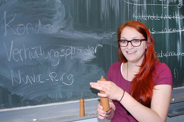 Im Gymnasium Karlsbad geht es nach einer kurzen Pause weiter mit dem „Grabbel-Sack“. Noch sind die Neuntklässler in ihre Unterhaltungen vertieft. „Jungs, wir wollen weitermachen!“, fordert Hannah Salzer einige der Schüler energisch auf. Nacheinander dürfen die Jugendlichen in einen Jutebeutel greifen und einen Gegenstand herausholen: Ans Licht kommen neben Kondomen, der Pille und einem Schwangerschaftstest ein Verhütungsring, Gleitgel, eine Spirale und ein Diaphragma. Die Medizinstudierenden erklären, was genau die Schüler in den Händen halten und wie sicher die Verhütungsmethoden darunter sind. „Ich finde es immer wieder erstaunlich, wie rudimentär das Wissen der Jugendlichen ist“, so Hannah Salzer: „Es heißt zwar immer, die Jugend von heute sei aufgeklärter denn je. Nur weil sie leichteren Zugang zu Pornoseiten im Internet hat, ist das aber noch lange nicht der Fall.“