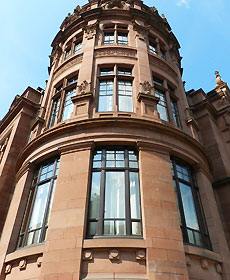 Die Universitätsbibliothek Heidelberg feierte 2015 nicht nur die Eröffnung der neuen Lesebereiche im Triplex-Gebäude, sondern sie erinnert sich auch an ihr 570-jähriges Baujubiläum und das 110-jährige Bestehen des Durm’schen Prachtbaus (Foto: Werschak), in dem sie bis heute residiert. 1445 erhielt sie als erste Universitätsbibliothek Deutschlands ein eigenes Gebäude. Diese frühe Institutionalisierung Mitte des 15. Jahrhunderts bezeugt, dass die Bibliothek schon damals eine bedeutende Rolle für ihre Alma Mater spielte. Die Büchersammlungen der Fakultäten, die bis dahin verstreut in der Stadt untergebracht waren, sollten zusammengelegt werden. In der Merianstraße, auf dem Areal der heutigen Jesuitenkirche, wurde ein einfaches, zweistöckiges Haus errichtet. Rund 840 Bände umfasste die Heidelberger Sammlung im Jahr 1466.